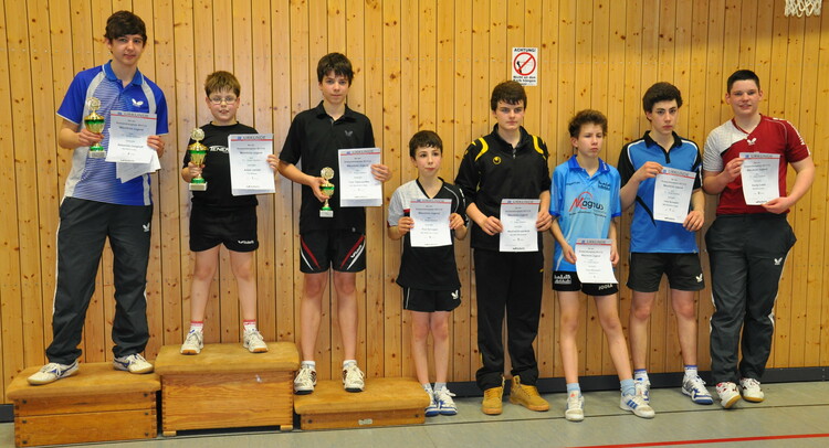 Schüler A: 1. 1. Adam Janicki (TTC Wißmar) 8:0, 2. Manfred Krupenkow (TSV Allendorf/Lda). 7:1, 3. Felix Brübach (Gießener SV) 6:2, 4. Nico Solbach (NSC W.-Steinberg) 4:4/17:16, 5. Lukas Neumann (TSV Allendorf/Lda.) 4:4/15:15, 6. Jan Kampermann (Gießener SV) 3:5, 7. Jannik Wittmann (NSC W.-Steinberg) 2:6, 8. Dennis Müller (Gießener SV) 1:7/7:22, 9. Felix Habermehl (TSG Leihgestern) 1:7/7:23.