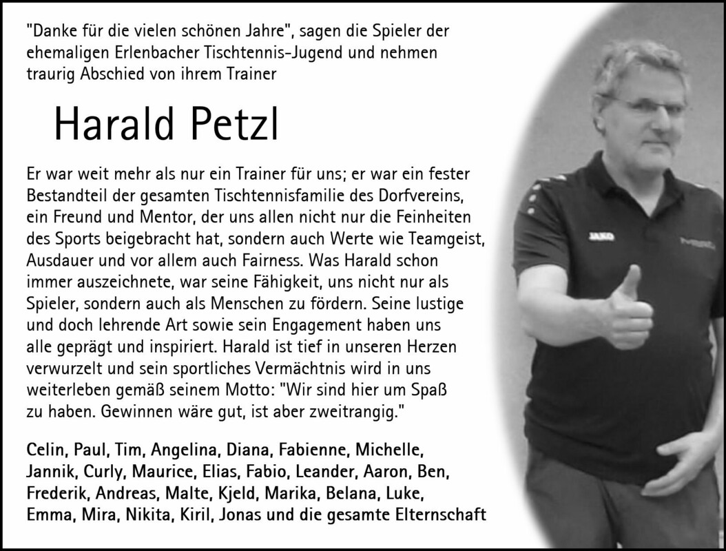 Dein Engagement, Dein Herzblut galt jedoch immer zuallererst den Kindern und Jugendlichen. Für sie hast Du gekämpft. Für Klartext und Machen warst Du bei Eltern, Funktionären bekannt. Die Kinder und Jugendlichen haben Dich nicht nur als Trainer, vielmehr als Mentor und Freund erlebt. Sie haben von Dir neben den Feinheiten des Tischtennis, auch Werte wie Teamgeist, Ausdauer, gegenseitige Unterstützung und Fairness nicht nur gelernt. sondern gelebt.