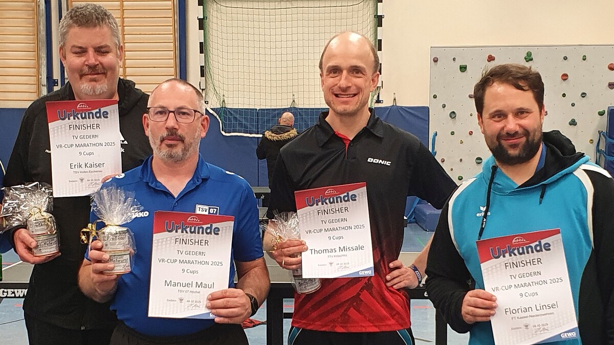 Weitere Top-Leistungen brachten Felix Kleinschmidt (TTG Büdingen-Lorbach, 6 Cups), Paul Franke (TTG Büdingen-Lorbach, 5 Cups), Andree Janz (TSV Stockheim, 5 Cups), Sirko Patz (TV Gedern, 5 Cups), Steffen Moritz (TSV Langgöns, 5 Cups) und Marvin Müller (TV Gedern, 4 Cups). Der zweimalige Finisher Lars Besemer vom TTV Selters musste nach fünf Cups passen – er hatte sich die Füße wundgelaufen. Allen gebührt größter Respekt.