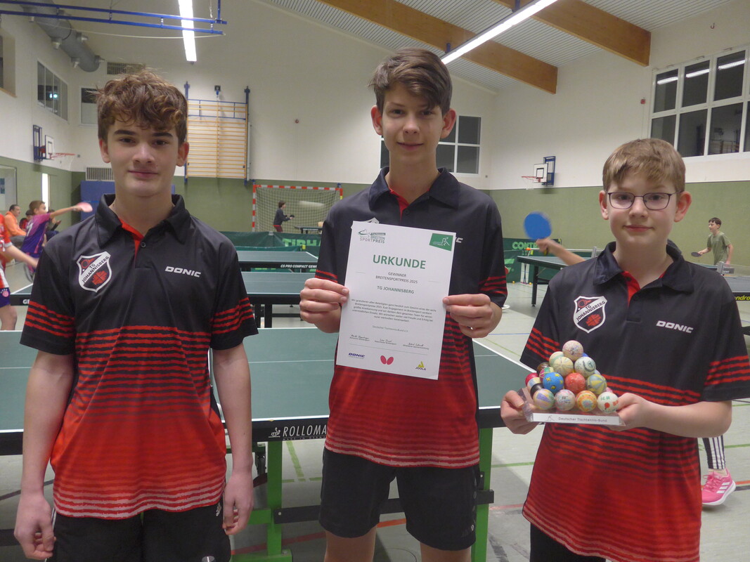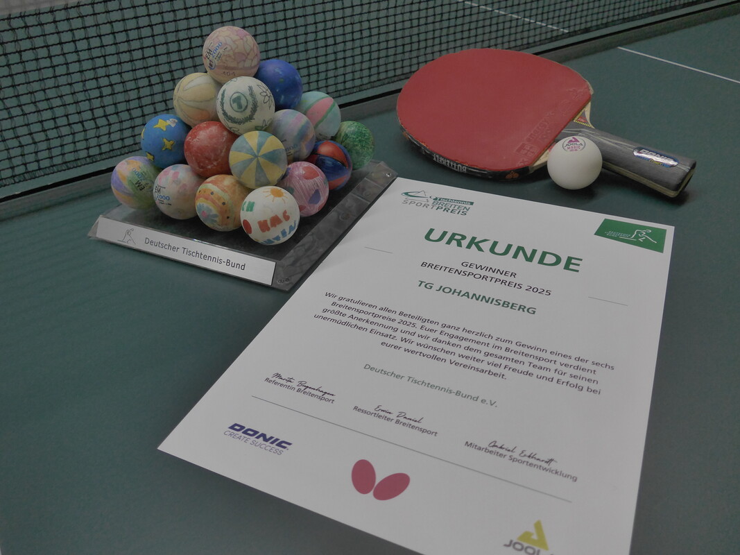 Großer Erfolg für die TG Johannisberg 1884 e. V. (Rheingau-Taunus-Kreis) Die Tischtennisabteilung des Vereins zählt zu den sechs Preisträgern des Breitensportpreises 2025 des Deutscher Tischtennis-Bund (DTTB). Darüber hinaus belegte der Verein beim Sonderpreis „Angebote für Mädchen“ einen hervorragenden zweiten Platz – ein deutliches Zeichen für die nachhaltige und gezielte Nachwuchsarbeit im Rheingau. Ausgezeichnet werden vom DTTB Vereine, die mit kreativen Ideen, nachhaltigen Konzepten und besonderem Engagement den Tischtennissport in der Breite stärken. Jede der sechs ausgezeichneten Initiativen erhält einen 500-Euro-Gutschein, eine DTTB-Ballpyramide sowie eine Urkunde.