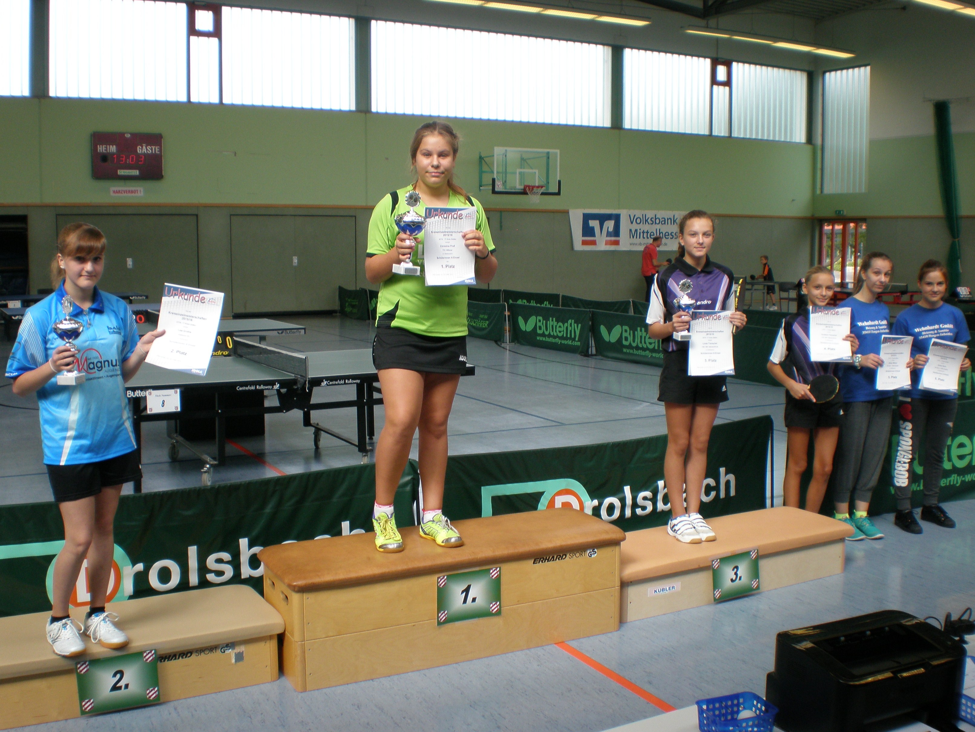 Weibliche Jugend Einzel (v.l.): 2. Lea Grothe (Gießener SV), 1. Samira Safabakhsh (TTC Wißmar), 3. Eileen Möbus (SV Inheiden).