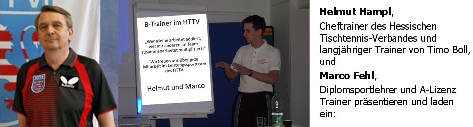 Angeleitet wird diese Ausbildung vom Team Helmut Hampl und Marco Fehl. Während Helmut Hampl mit seinem Verbands-Trainerteam den praktischen Part in der Turnhalle mit leistungssportlich trainierenden Kindern und Jugendlichen des Verbandes organisiert, übernimmt Marco Fehl die Aufgabe, per Videoanalyse und Auswertungsgespräche deine Arbeit als Trainer in der Halle aus kommunikativer Sicht zu verbessern. Außerdem hilft er dir beim sanften Einstieg in den Bereich der Sportwissenschaft in Bezug auf leistungssportlich orientiertes Tischtennistraining.